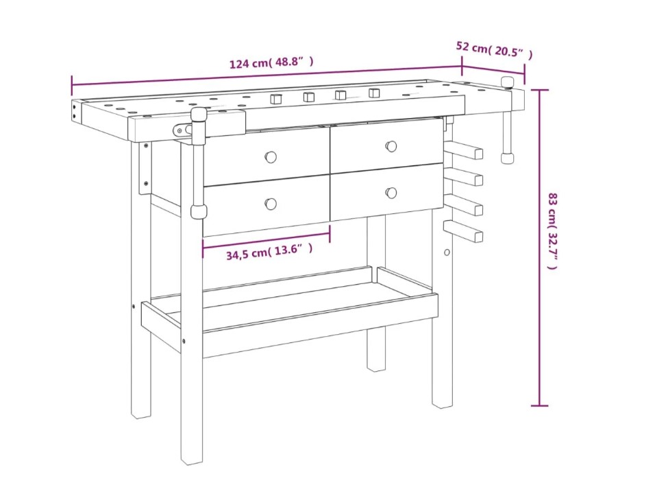 Dostatek úložného prostoru: Pracovní stanice se 4 zásuvkami a polici poskytuje dostatek místa pro přehledné uspořádání nářadí.