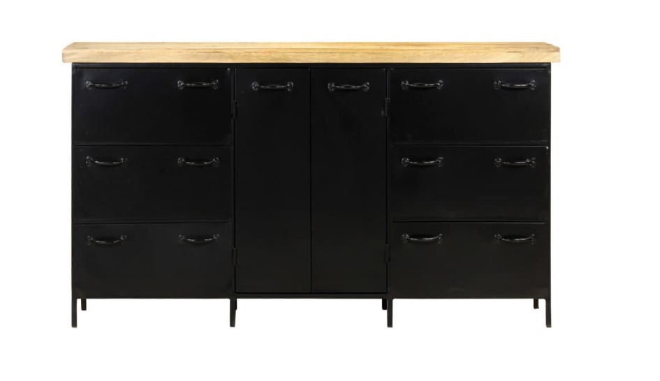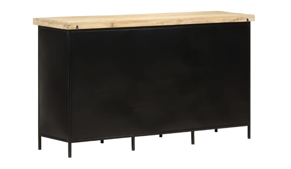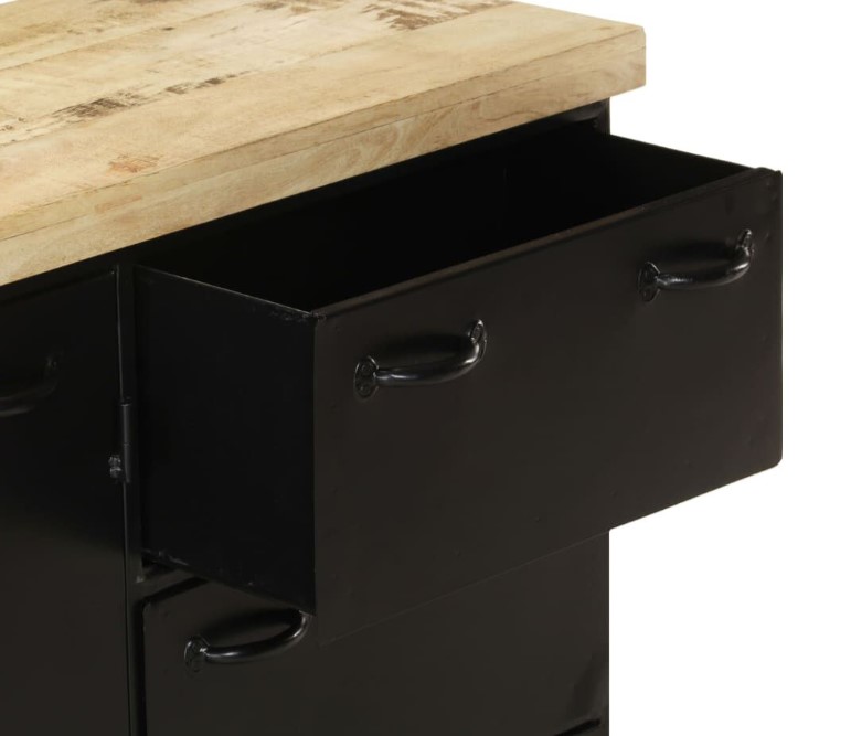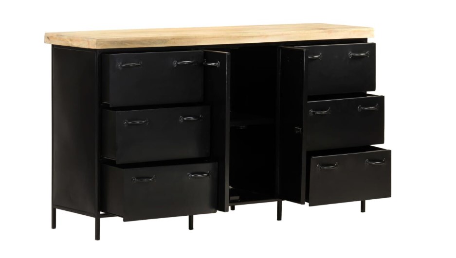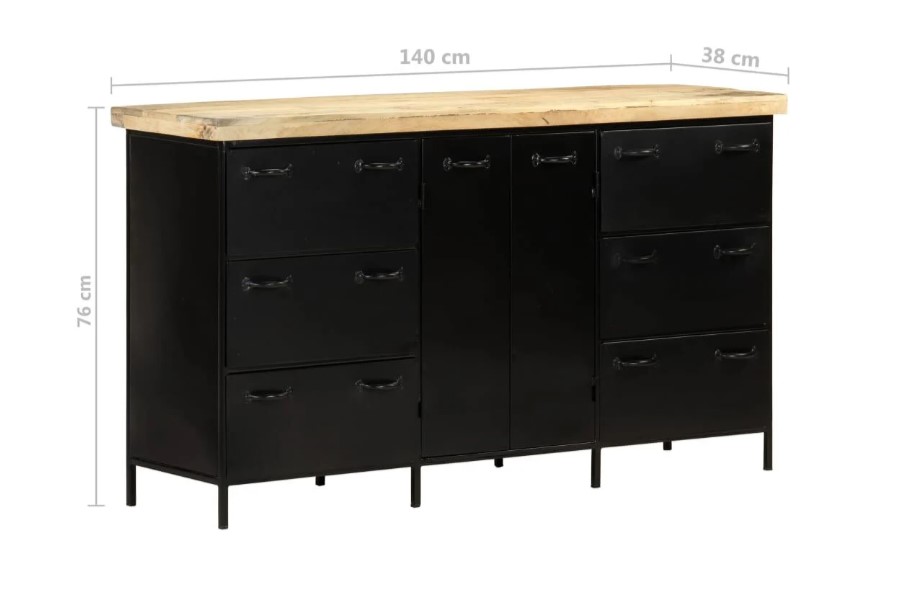 Příborník je vyrobený z masivního hrubého mangovníkového dřeva. Toto tropické tvrdé dřevo unese značnou váhu, skvěle odolává opotřebení a působení času, takže je velmi stabilní a trvanlivé. Pevnost a robustnost doplňuje práškově lakovaný ocelový rám. Nábytek disponuje 6 zásuvkami a přihrádkou se 2 dvířky, které poskytují dostatek úložného prostoru. Horní deska je ideální pro vystavení dekorací, fotografií, květin či dalších předmětů.